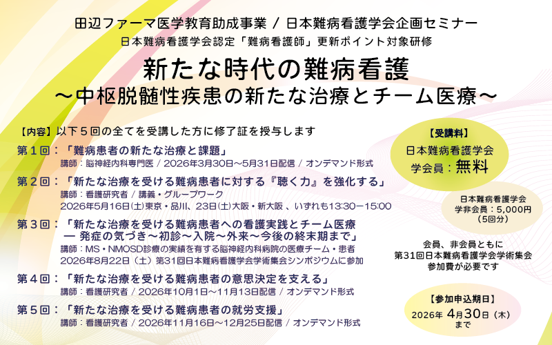 - 2026.03.16日本難病看護学会セミナー「新たな時代の難病看護 ~中枢脱髄性疾患の新たな治療とチーム医療~」(田辺ファーマ医学教育助成)受講者募集のご案内